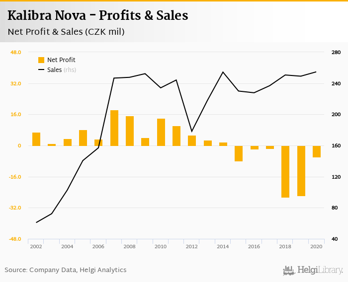 Kalibra Nova made a net profit of CZK -5.94 mil in 2020, up 77% compared to the previous year. Total sales reached CZK 255 mil, which is up 2.26% when compared to the previous year.