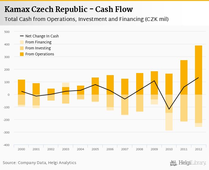 Cash from financing amounted to CZK -29.1 mil, so the company generated CZK 133 mil net cash in 2012.