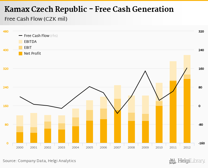 The company generated cash, defined by a sum of net profit and depreciation, of CZK 358 mil or 22.2% of sales. When investments are excluded, free cash flow reached CZK 162 mil, or 10.1% of sales in 2012.