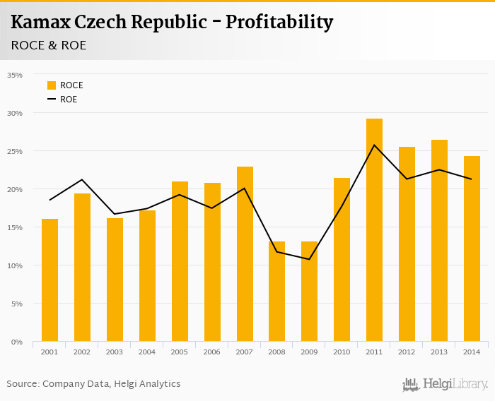 As far as Kamax Czech Republic's peers are concerned, Varroc Lighting Systems Czech Republic generated ROE of 39.2% and ROCE of 30.7% in 2014. Automotive Lighting's profitability reached 43.1% and 35.9%, respectively. Continental Automotive Czech Republic operated with 17.7% and 4.79% returns in 2014.