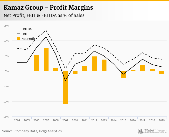 Kamaz Group made a net profit of RUB -1.89 bil with revenues of RUB 190 bil in 2019, down by 262% and up by 2.27%, respectively, compared to the previous year.