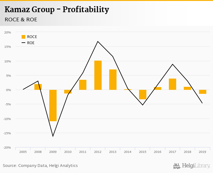 Kamaz Group made a net profit of RUB -1.89 bil in 2019, down 262% compared to the previous year. Historically, between 2004 and 2019, the company's net profit reached a high of RUB 7.43 bil in 2007 and a low of RUB -6.93 bil in 2009.