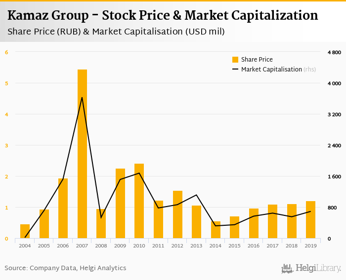 Kamaz Group stock traded at RUB 1.21 per share at the end 2019 implying a market capitalization of USD 689 mil.