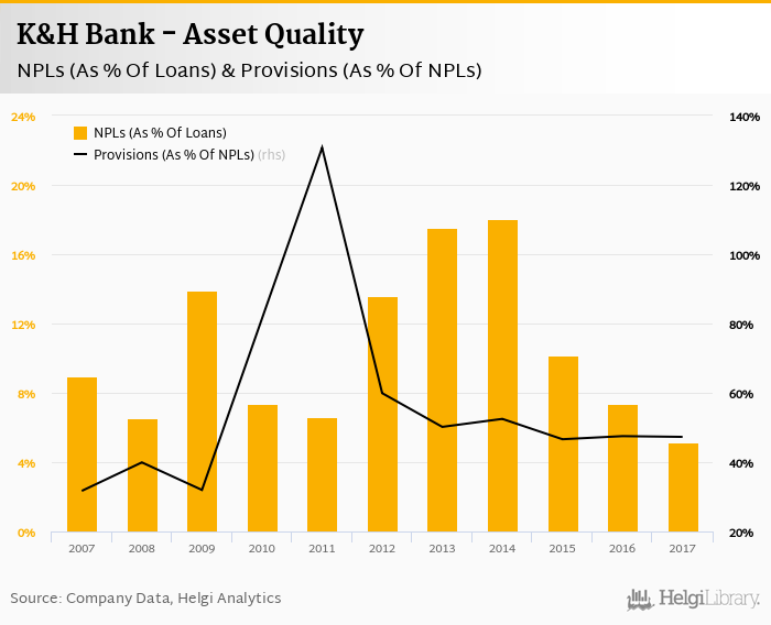 K&H Bank's non-performing loans reached 5.17% of total loans at the end of 2017, down from 7.34% compared to the previous year. Historically, the NPL ratio hit an all time high of 18.1% in 2014 and an all time low of 5.17% in 2017.