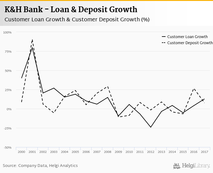 K&H Bank's customer loan growth reached 12.8% in 2017, up from 4.02% compared to the previous year. Historically, the bank’s loans growth reached an all time high of 79.5% in 2001 and an all time low of -24.1% in 2012. In the last decade, the average annual loan growth amounted to -1.39%.
