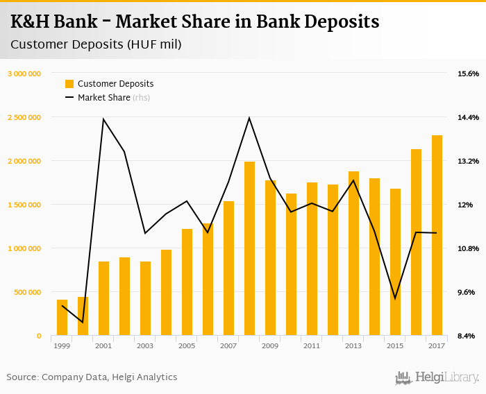 K&H Bank accounted for 11.2% of all customer deposits taken by banks in Hungary at the end of 2017. Historically, the bank’s market share in customer deposits reached an all time high of 14.4% in 2008 and an all time low of 8.75% in 2000.