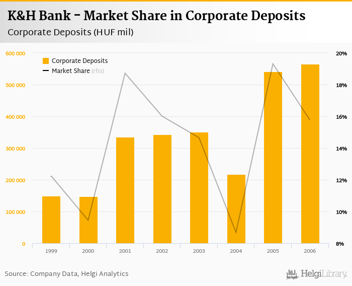 K&H Bank accounted for 15.8% of all corporate deposits taken by banks in Hungary at the end of 2006. Historically, the bank’s market share in corporate deposits reached an all time high of 19.3% in 2005 and an all time low of 8.68% in 2004.