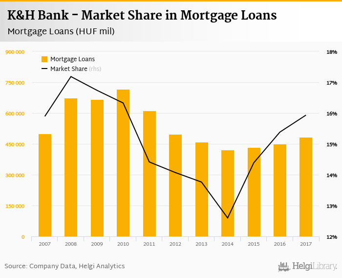 K&H Bank accounted for 15.9% of all mortgage loans issued in Hungary at the end of 2017. Historically, the bank’s market share in mortgage loans reached an all time high of 17.2% in 2008 and an all time low of 12.6% in 2014.