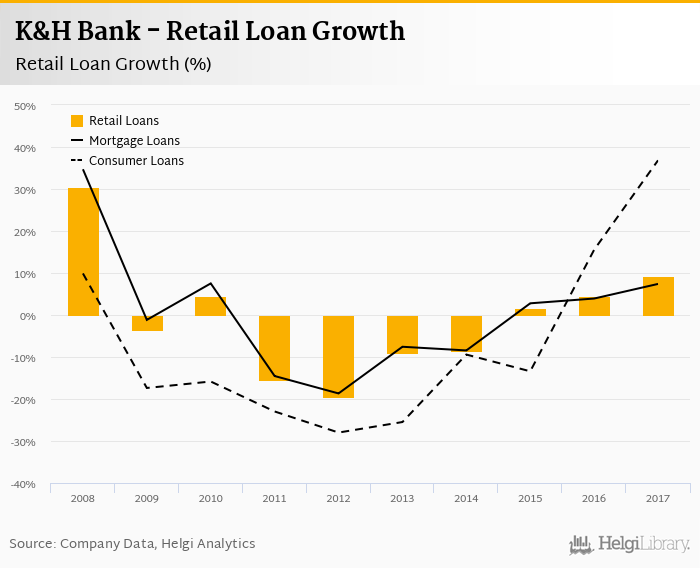 K&H Bank's retail loans reached HUF 523,887 mil at the end of 2017, up 9.24% compared to the previous year. In the last decade, the average annual loan growth amounted to 0%.