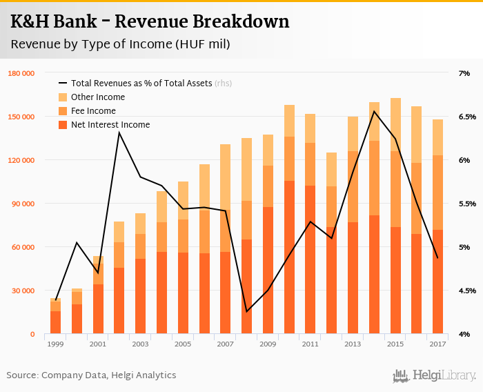 Comparing K&H Bank with its closest peers, OTP Group generated total revenues of 6.54% of assets in 2017, Raiffeisen Bank Hungary operated with 4.12% revenue margin and MKB Bank produced total income worth 3.85% of assets.