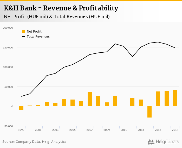 K&H Bank made a net profit of HUF 41,669 mil under revenues of HUF 147,864 mil in 2017, up 5.76% and -5.92% respectively compared to the previous year.