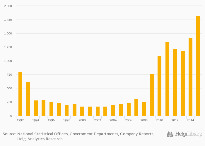 Historically, kaolin production in Ukraine reached an all time high of 1,815 kt in 2015 and an all time low of 170 kt in 2003. When compared to Ukraine's main peers, kaolin production in Poland amounted to 171 kt, 30.0 kt in Romania and 45.0 kt in Russia in 2015.
