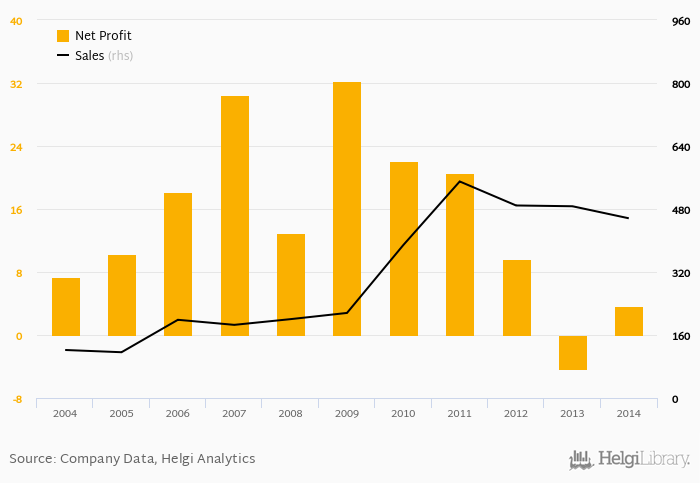 Historically, between 2004 and 2014, the company’s net profit reached a high of EUR 32.2 mil in 2009 and a low of EUR -4.30 mil in 2013. Over the last decade the firm's net profit decreased by an average of 6.76% a year.