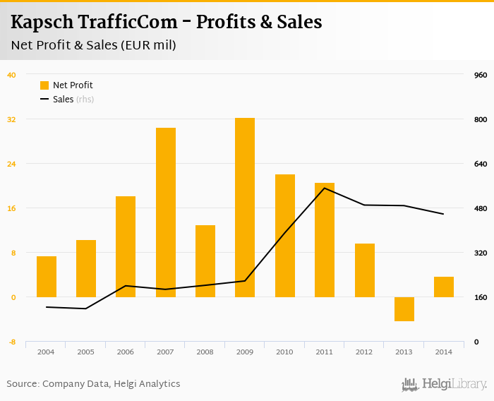 As far as Kapsch TrafficCom's peers are concerned, Austria Technologie & Systemtechnik posted a net profit and sales of EUR 69.3 mil and EUR 667 mil in 2014, Ericsson Nikola Tesla generated a net profit of HRK 87.4 mil (with sales of HRK 1,315 mil), and Austrian Post netted USD EUR 147 mil (sales of EUR 2,371 mil).