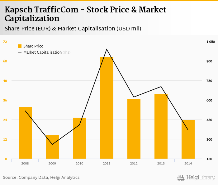 Kapsch TrafficCom stock traded at EUR 23.9 per share at the end 2014 implying a market capitalization of USD 368 mil.