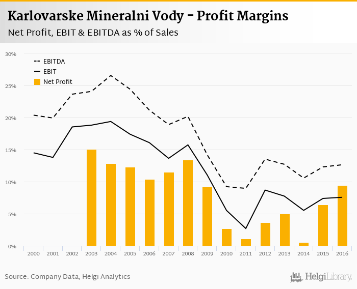 Karlovarske Mineralni Vody made a net profit of CZK 316 mil with revenues of CZK 3,327 mil in 2016, up by 49.9% and up by 2.05%, respectively, compared to the previous year.