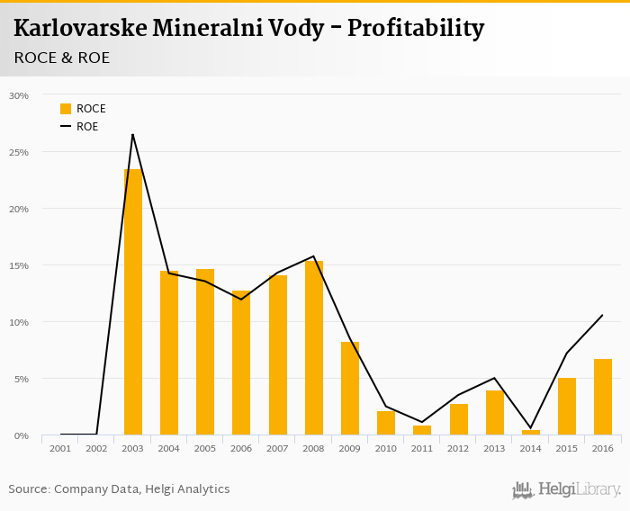 As far as Karlovarske Mineralni Vody's peers are concerned, Kofola generated ROE of 3.09% and ROCE of 1.87% in 2016. Jan Becher - Karlovarska Becherovka's profitability reached 24.3% and 31.9%, respectively. Stock Spirits Group operated with 7.97% and 5.04% returns in 2016.