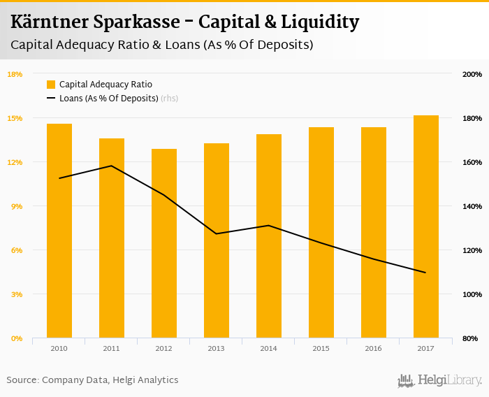 Kärntner Sparkasse's capital adequacy ratio reached 15.2% at the end of 2017, up from 14.4% compared to the previous year. Historically, the bank’s capital ratio hit an all time high of 15.2% in 2017 and an all time low of 12.9% in 2012.