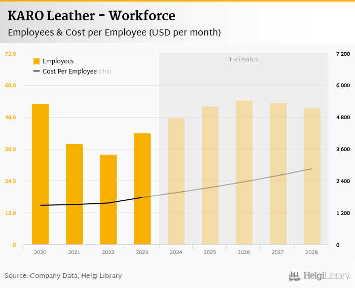 KARO Leather employed 42.0 employees in 2023, up 23.5% compared to the previous year. Historically, between 2020 and 2023, the firm's workforce hit a high of 53.0 employees in 2020 and a low of 34.0 employees in 2022.
