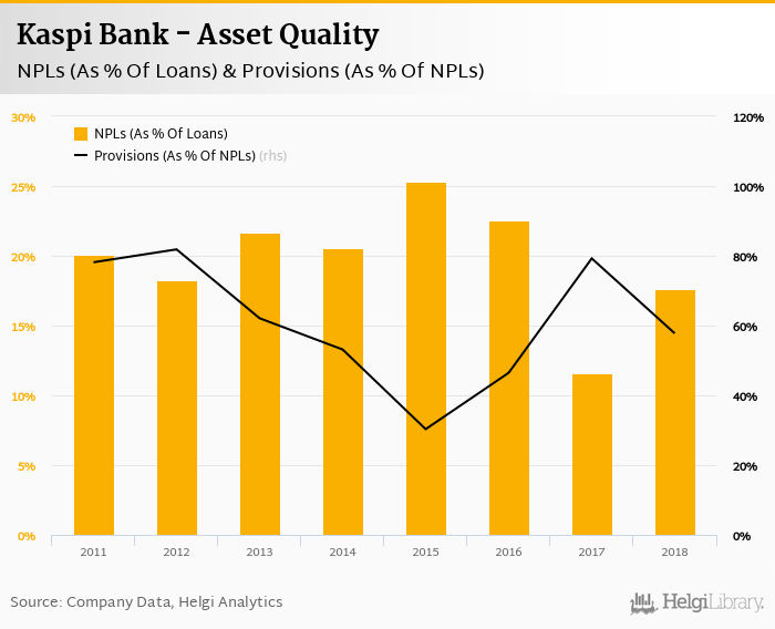 Kaspi Bank's non-performing loans reached 17.6% of total loans at the end of 2018, up from 11.6% compared to the previous year. Historically, the NPL ratio hit an all time high of 25.3% in 2015 and an all time low of 11.6% in 2017.