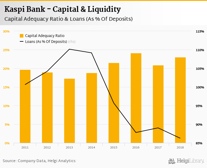 Kaspi Bank's capital adequacy ratio reached 23.0% at the end of 2018, up from 20.9% compared to the previous year. Historically, the bank’s capital ratio hit an all time high of 24.1% in 2016 and an all time low of 17.3% in 2013.
