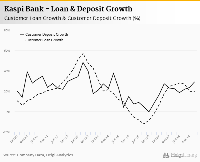 Kaspi Bank's customer loan growth reached 19.6% in 2019-03-31, down from 25.9% compared to the previous year. Historically, the bank’s loans growth reached an all time high of 56.8% in 2013-09-30 and an all time low of -12.4% in 2016-09-30. In the last decade, the average annual loan growth amounted to 0%.