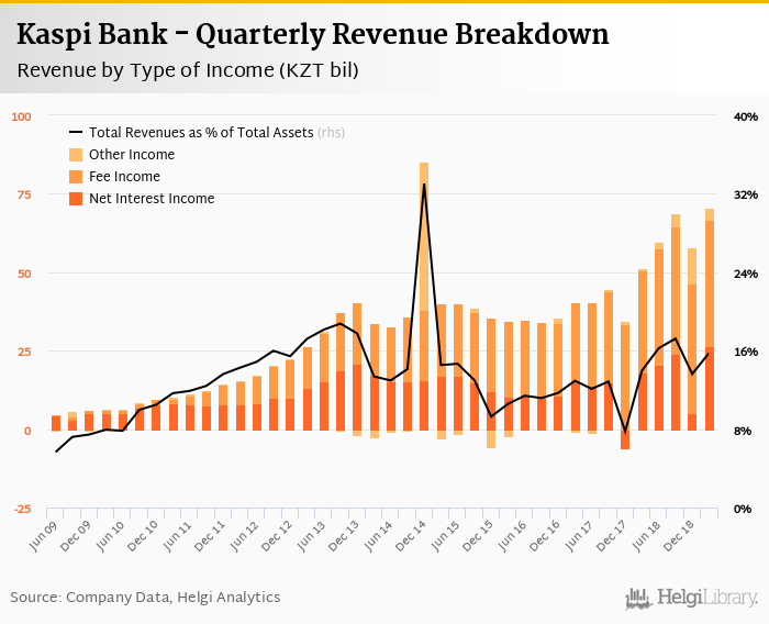 Kaspi Bank generated total banking revenues of KZT 70.8 bil in the first quarter of 2019, up 37.4% when compared to the same period of last year and 22.3% when compared to the previous quarter.