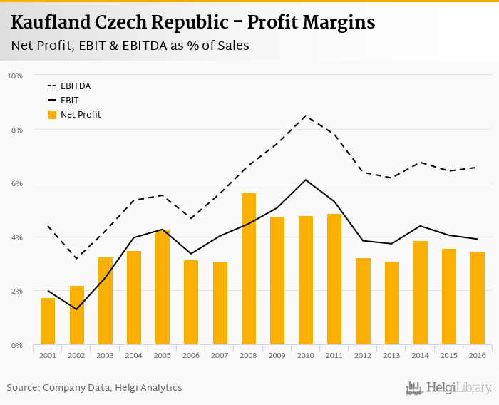 Kaufland Czech Republic made a net profit of CZK 1,974 mil with revenues of CZK 56,819 mil in 2016, down by 5.53% and down by 2.62%, respectively, compared to the previous year.