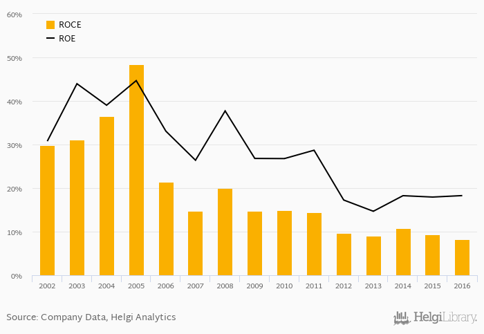 The result implies a return on equity of 18.3% and a return on invested capital of 8.22% in 2016. That is compared to an average of 17.3% and 9.42% over the last five years.