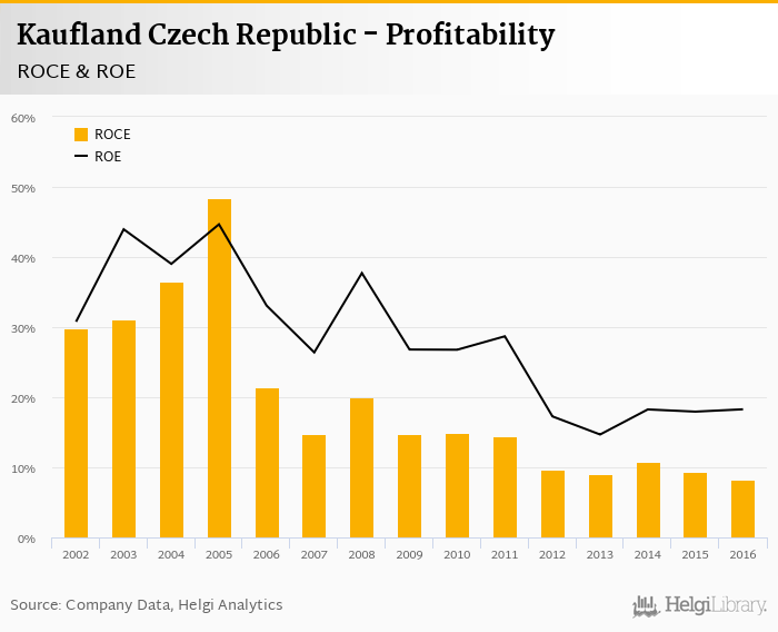 As far as Kaufland Czech Republic's peers are concerned, Ahold Czech Republic generated ROE of 0.294% and ROCE of 0.036% in 2016. BILLA Czech Republic's profitability reached 13.5% and 11.3%, respectively. Lidl Czech Republic operated with 52.5% and 26.1% returns in 2016.