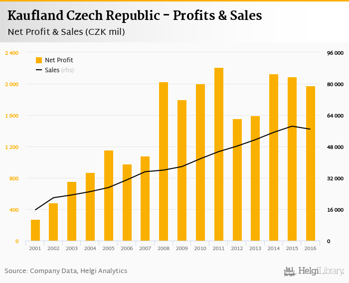 Kaufland Czech Republic made a net profit of CZK 1,974 mil in 2016, down 5.53% compared to the previous year. Total sales reached CZK 56,819 mil, which is down 2.62% when compared to the previous year.