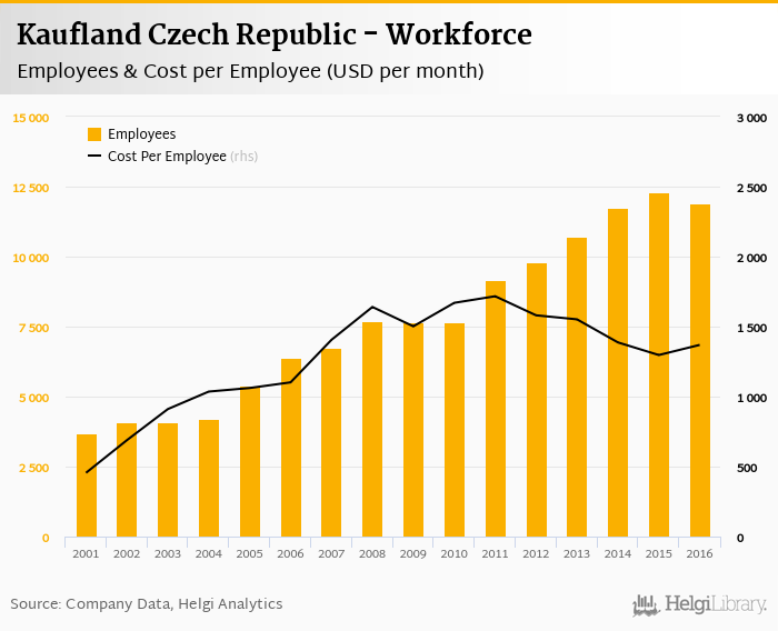Kaufland Czech Republic employed 11,914 employees in 2016, down 3.15% compared to the previous year. Historically, between 2000 and 2016, the firm's workforce hit a high of 12,302 employees in 2015 and a low of 3,165 employees in 2000.