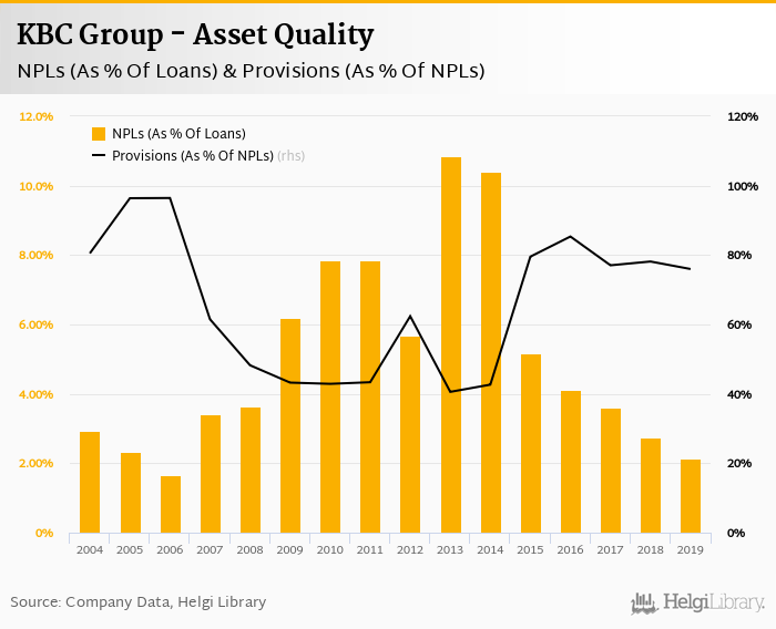 KBC Group's non-performing loans reached 2.15% of total loans at the end of 2019, down from 2.73% compared to the previous year. Historically, the NPL ratio hit an all time high of 10.8% in 2013 and an all time low of 1.65% in 2006.
