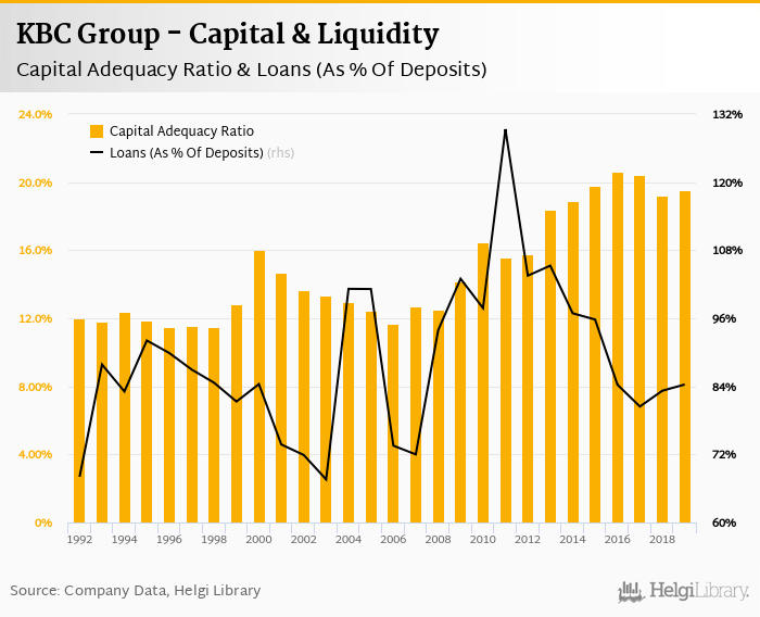 KBC Group's capital adequacy ratio reached 19.6% at the end of 2019, up from 19.2% compared to the previous year. Historically, the bank’s capital ratio hit an all time high of 20.6% in 2016 and an all time low of 11.5% in 1998.