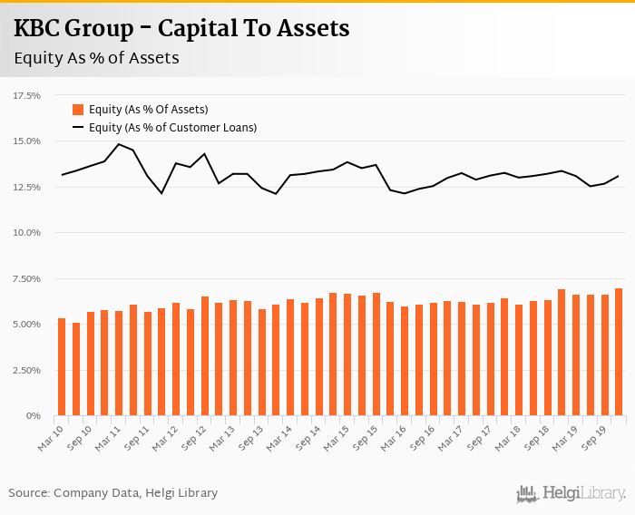 KBC Group's Equity reached 7.00% of total assets in the 4Q2019, up from 6.92% for the previous year. As a share of net customer loans, the ratio amounted to 13.1% at the end of the fourth quarter of 2019.