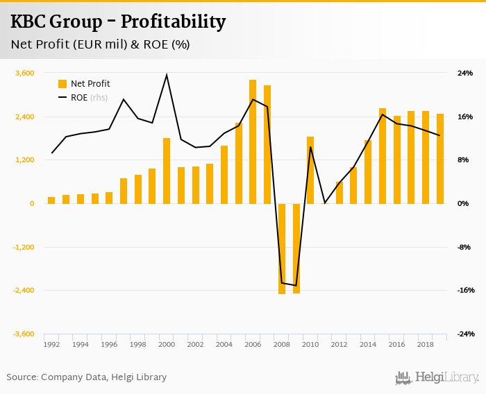KBC Group made a net profit of EUR 2,489 mil in 2019, down 3.15% compared to the previous year. This implies a return on equity of 12.4%.