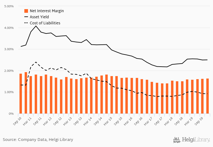 Historically, the bank’s net interest margin reached an all time high of 1.94% in 4Q2010 and an all time low of 1.41% in 4Q2017. The average margin in the last six quarters amounted to 1.60%.