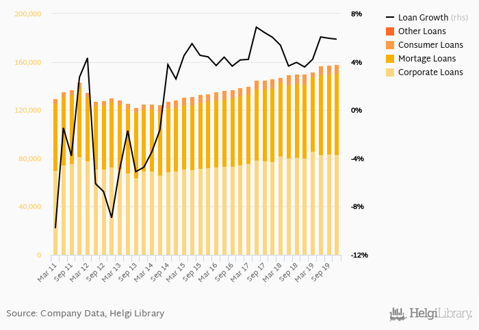 Mortgage loans represented 42.8% of the bank's loan book at the end of the year 4Q2019, consumer further 4.59% and corporate loans 52.6% of total loans.