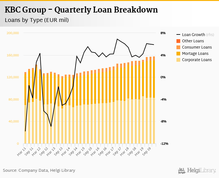KBC Group's loans reached EUR 158,182 mil in the fourth quarter of 2019, up from EUR 157,296 mil when compared to the previous quarter and up from EUR 150,157 mil when compared to the same period of last year. Historically, the bank’s loans reached an all time high of EUR 158,182 mil in 4Q2019 and an all time low of EUR 122,134 mil in 3Q2013.