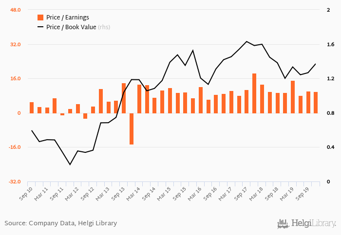 In terms of price to book value, the stock reached 1.37x at the end of 4Q2019. Since the fourth quarter of 2014, the multiple reached an all time high of 1.63x in 3Q2017 and an all time low of 1.13x in 2Q2016 with an average of 1.39x.