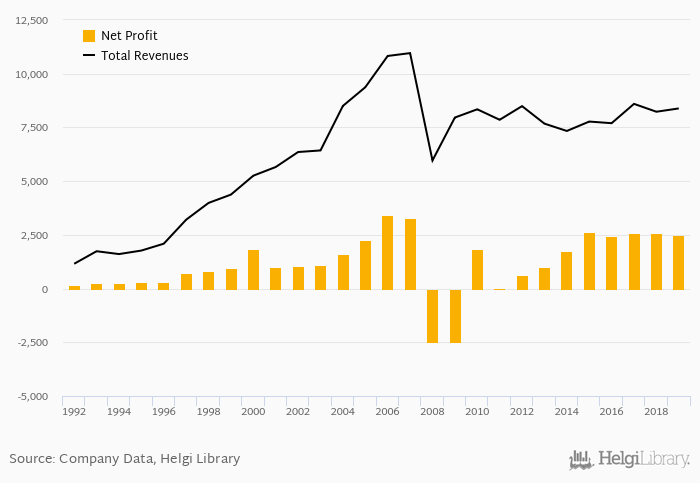 Historically, the bank’s net profit reached an all time high of EUR 3,430 mil in 2006 and an all time low of EUR -2,484 mil in 2008. The average profit in the last five years amounted to EUR 2,540 mil.