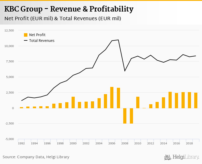KBC Group made a net profit of EUR 2,489 mil under revenues of EUR 8,384 mil in 2019, up -3.15% and 1.87% respectively compared to the previous year.
