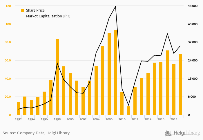Since the end of 2014, the stock has appreciated by 44.2 % implying an annual average growth of 7.59 %. In absolute terms, the value of the company rose by USD 6,891 mil.