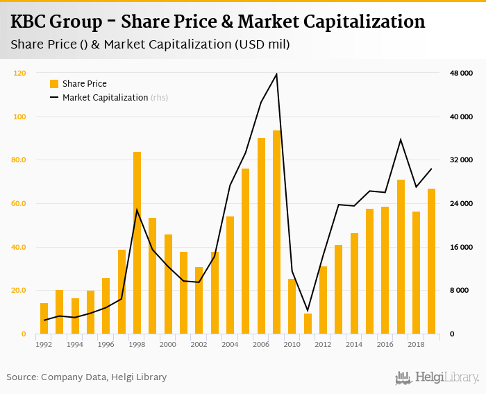 KBC Group stock traded at 67.1 per share at the end of 2019 implying a market capitalization of USD 30,402 mil.
