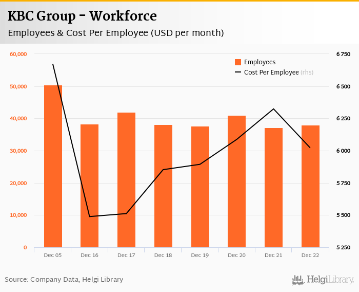 KBC Group employed 37,946 persons in 2022-12-31, down 0% when compared to the previous year. Historically, the bank's workforce hit an all time high of 50,479 persons in 2005-12-31 and an all time low of 37,194 in 2021-12-31.