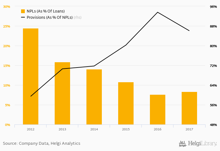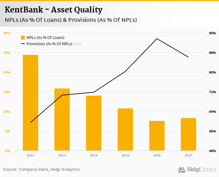 KentBank's non-performing loans reached 8.37% of total loans at the end of 2017, up from 7.59% compared to the previous year. Historically, the NPL ratio hit an all time high of 24.5% in 2012 and an all time low of 7.59% in 2016.