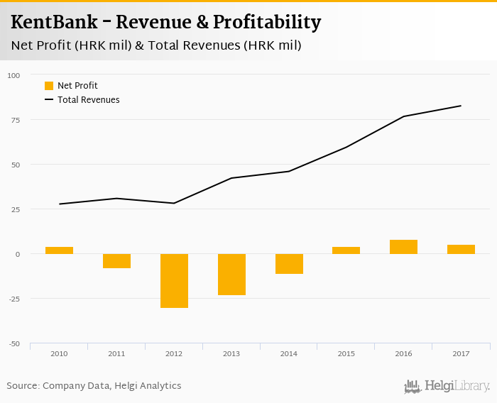 KentBank made a net profit of HRK 5.24 mil under revenues of HRK 82.5 mil in 2017, up -35.6% and 7.80% respectively compared to the previous year.