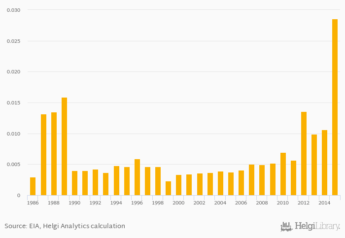 Kerosene consumption as a share of worldwide consumption rose 169% to 0.029% in Brunei in 2015, according to EIA.