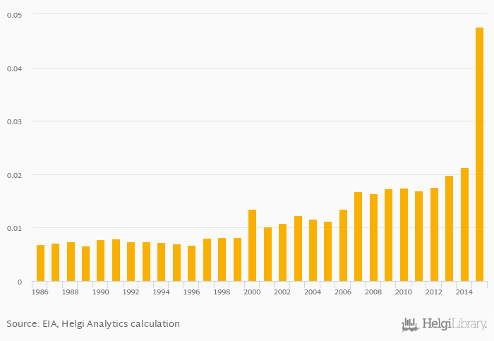 Kerosene consumption as a share of worldwide consumption rose 124% to 0.048% in Equatorial Guinea in 2015, according to EIA.