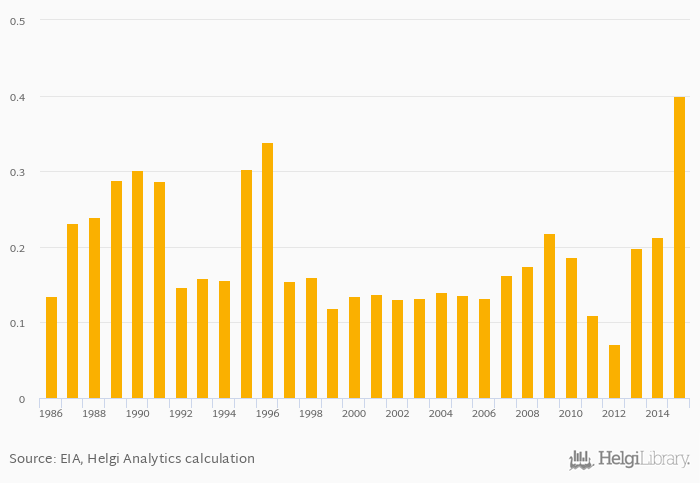 Kerosene consumption as a share of worldwide consumption rose 88.3% to 0.400% in Yemen in 2015, according to EIA.